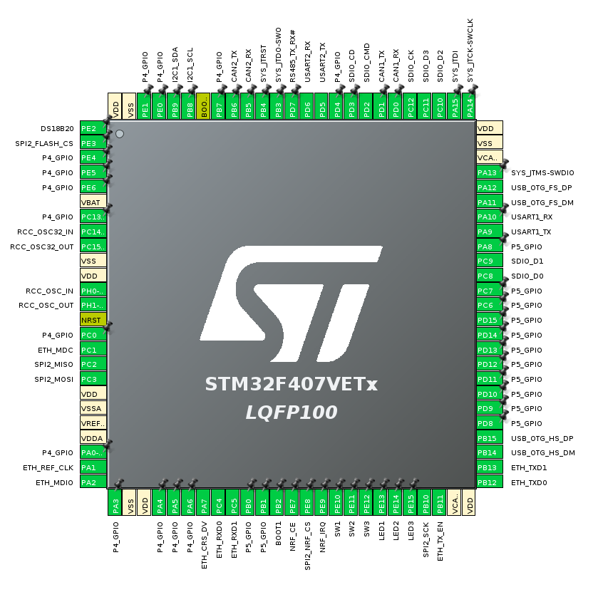 Alle integrierten Peripheriegeräte funktionieren. Dies ist die Pinbelegung des Haupt-SoCs, wie sie in CubeMX dargestellt ist: